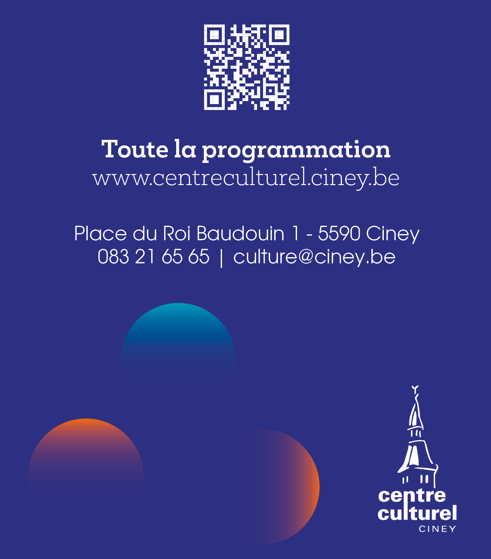 Théâtre, cinéma, exposition, atelier, stage, théâtre wallon, bourse de collections… Le Centre Culturel de Ciney propose bien plus que vous ne l’imaginez. Une programmation pour tous les publics, toutes générations confondues, pensée pour partager, s’émouvoir et vivre des moments ensemble. Découvrez tout le programme sur www.centreculturelciney.be