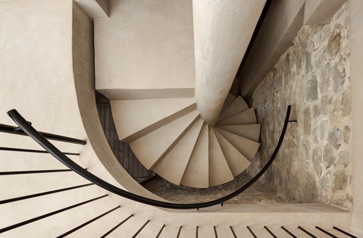 Dans cette maison rénovée, un escalier en colimaçon a été habillé avec le revêtement MORTEX®, offrant à l’espace une touche esthétique moderne tout en conservant une résistance exceptionnelle, même dans un environnement humide.